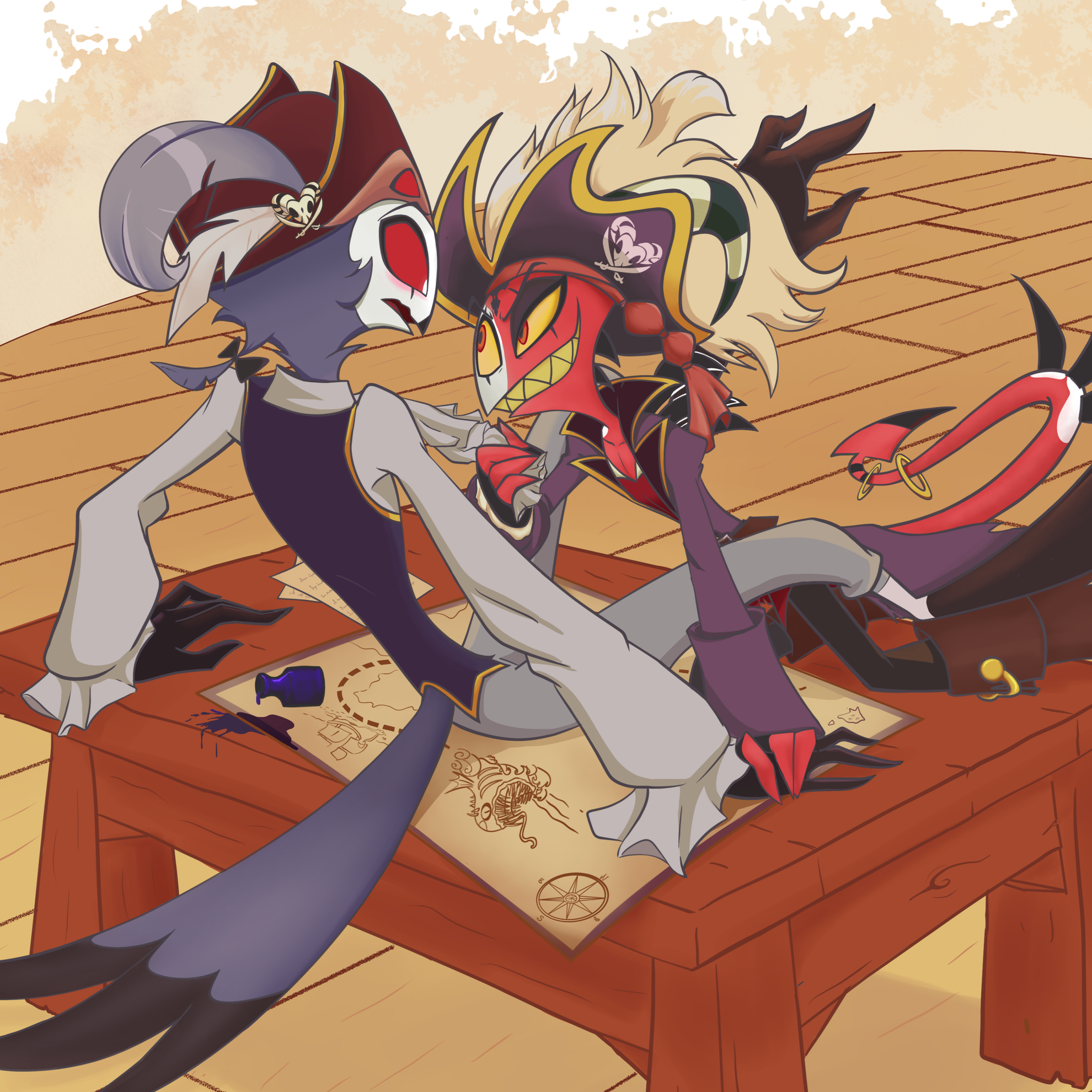 They’re illustrating The Hanged Man with Angel Dust and the Six of Cups featuring Blitz and Fizz — a dream lineup, given their love for Angel and Blitzfizz.